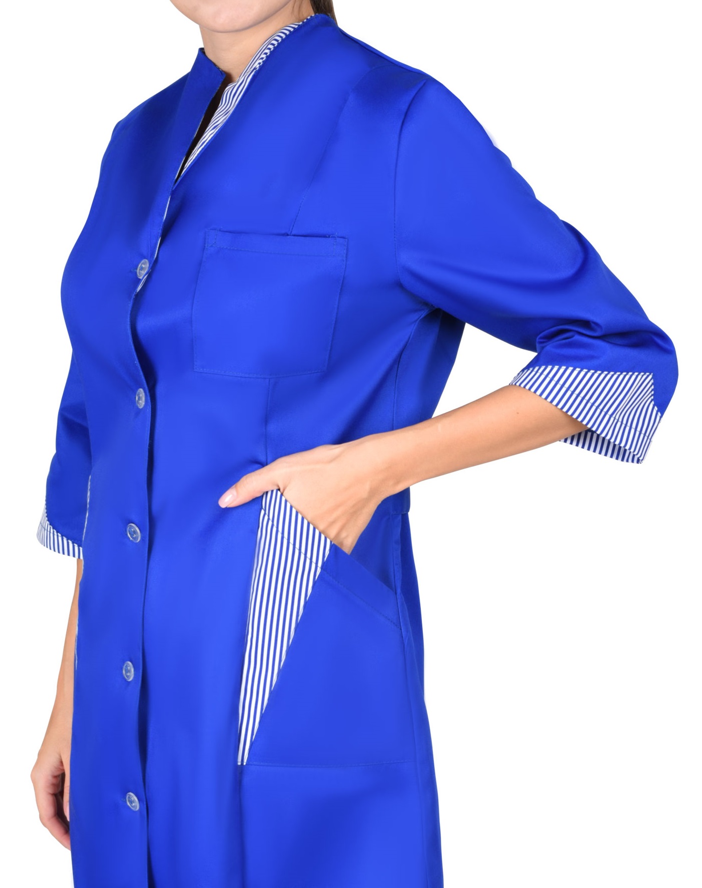 Описание товара: халат приталенного силуэта с застёжкой на пуговицы. На полочках вертикальные рельефы, один верхний и два нижних накладных кармана. На лацканах, нижних карманах и рукавах отделка из ткани контрастного оттенка. Рукава 3/4.