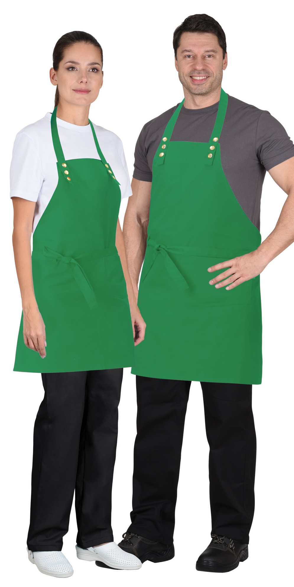 Описание товара: фартук универсальный для сферы обслуживания зеленый. Фартук с нагрудником и с боковыми завязками для регулировки объема. Сьемная шейная бретель, пристегивающаяся на кнопки. В нижней левой части накладной карман. На правой стороне фартука, на уровне притачивания боковых завязок, шлёвка.